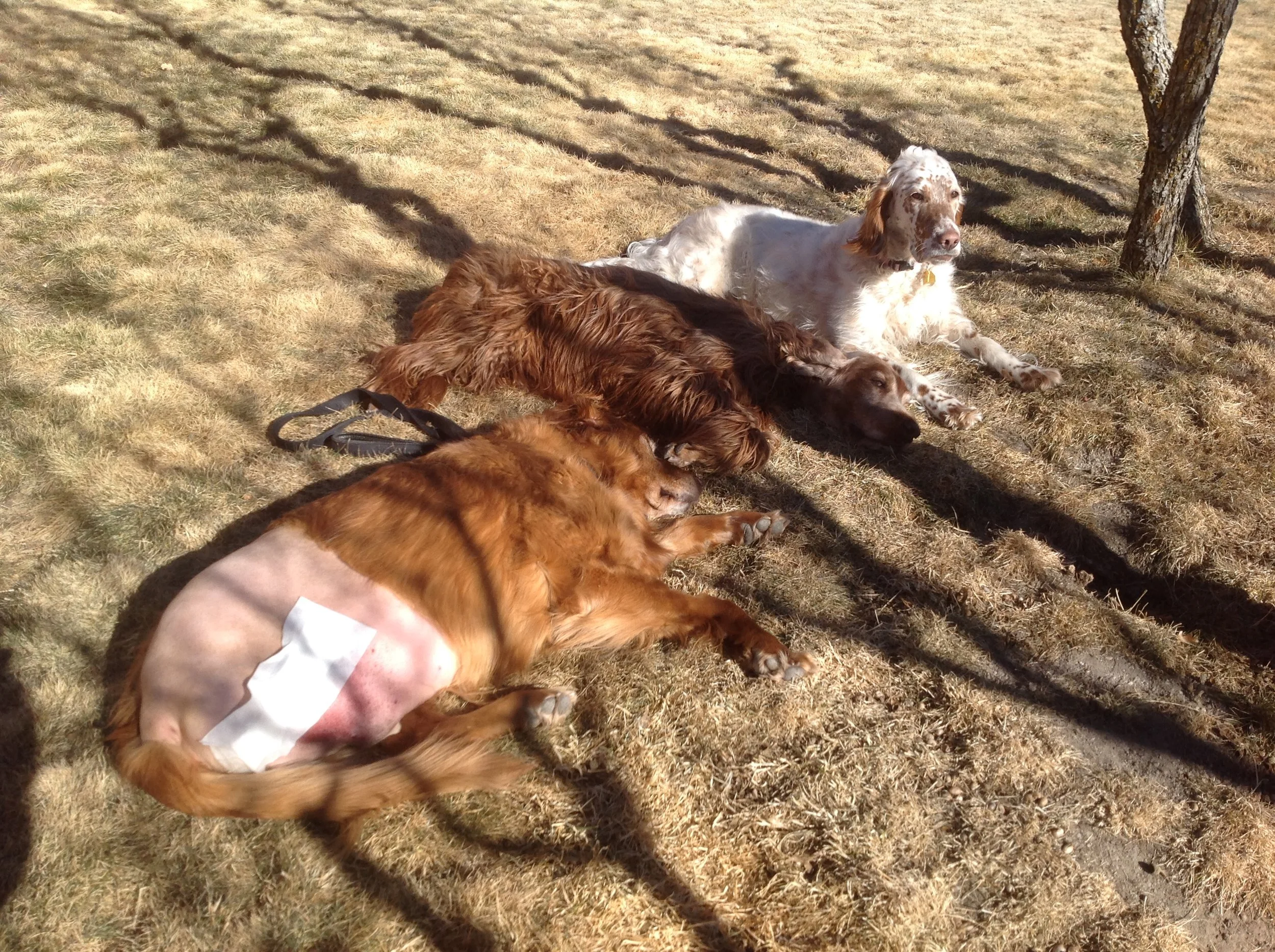 Seamus’s recovery was clinically “unremarkable” but truly inspiring for everyone else around him. In spite of the worry over wound cleanliness (easily remedied by a t-shirt worn backward from hind end toward front and pinned relatively tight around the chest), he settled into a routine of healing and regaining his strength, aided by temporary pharmaceuticals to manage pain.