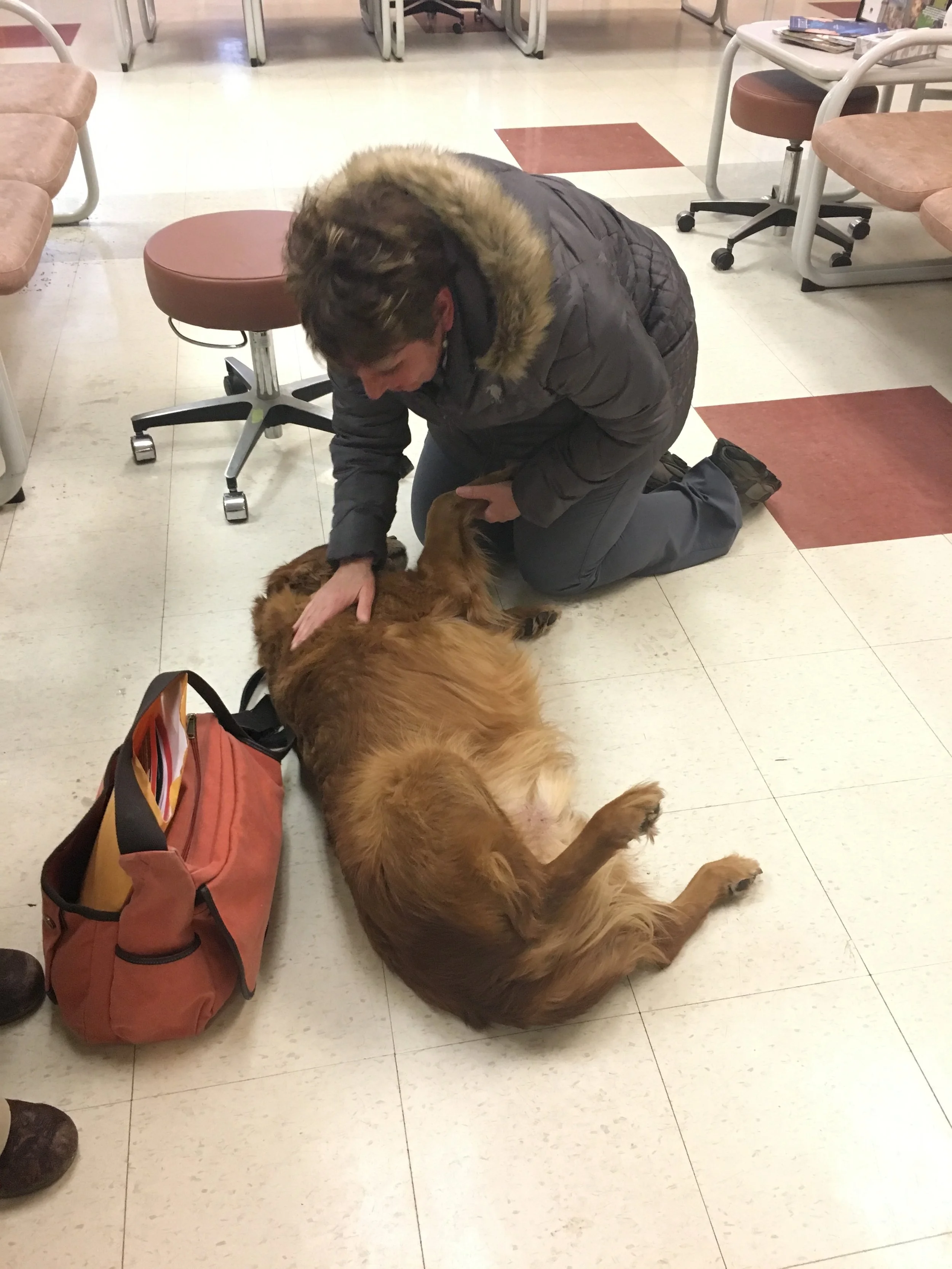 By now Seamus had amassed an entourage of clinicians and students rooting for him because he has the most indomitable and affectionate spirit. Everyone who knows him loves him. We proudly call him Seamus the Wonder Dog because he is one of the lucky ones who, given his circumstances, has surpassed life expectancy. I can’t possibly name all of the special people who have been a part of his journey, sharing their gifts of knowledge and craft paired with genuine care for the animals in their charge. One day when I was leaving the hospital with him, a veterinarian was walking across the parking lot, and she called out, “Is that Seamus?” I had no idea who she was, but she knew him, and proceeded to tell me how he had quite the fan club. I can’t help but feel that all animals seen at CSU have a fan club. I have witnessed so many stories of resilience, love, and human-animal bonding in that waiting room, and I have witnessed many miracles of reunion and acts of human kindness, including the sweet volunteers who break the sometimes long hours of tense waiting and worrying with an offer of coffee, tea, or the mother of all elixirs, M&Ms. On several occasions I was offered a quiet meeting room or an unoccupied office so that I could do my work while waiting.